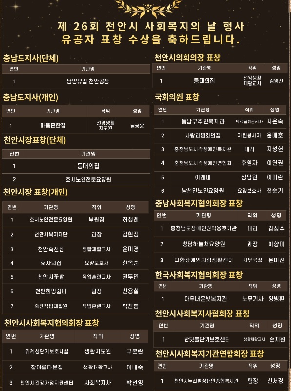 제 26회 천안시사회복지의 날 행사 유공자 표창수상 페이지 정보 작성자작성자 : 천사협 조회조회수 : 2,383회 작성일작성일 : 25-09-23 13:14 본문 수상을 축하 드립니다! 목록 이전글2025년 법인 정기 이사회의(2차) 개최 25.03.11 다음글「제26회 천안시사회복지의 날 행사」사회복지 유공자 추천 협조 요청 25.07.28